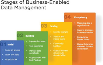 This maturity model for business-enabled MDM follows four stages for balanced approach to develop mastering data as a capability.